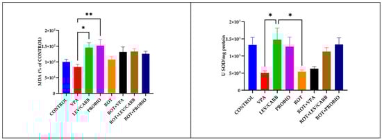 The evaluation of oxidative biomarkers revealed a statistically significant difference in the level of MDA between (b) VPA and (c) LEV/CARB (p = 0.023) and compared to (d) PROBIO (p = 0.009). There are also changes in the enzymatic activity of SOD when comparing the same groups (p = 0.025). The SOD activity is lower in (e) ROT compared to (c) LEV/CARB (p = 0.034), in relation to the MDA level in the group (e) ROT. Contrary to our expectations, there is no difference between the (a) CONTROL group and the experimental groups exposed to ROT. Even though the activity of SOD in (f) ROT+VPA is similar to that of (e) ROT, there is no noticeable difference when comparing the results between ROT-exposed groups (p > 0.05). Slight instabilities in the level of MDA in (f) ROT+VPA, (g) ROT+LEV/CARB, and (h) ROT+PROBIO analogous to (a) CONTROL and (h) ROT+PROBIO in SOD are observable (Figure 6).