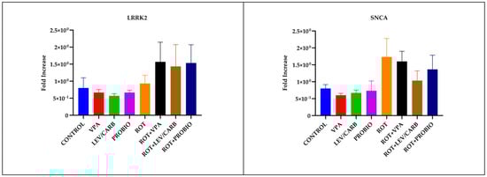 Although the overproduction of ROS is well known to be a significant trigger of various sequential consequences which culminate in dopaminergic neuron destruction, mitochondrial dysfunction may affect αS in a feedback loop, regulated by the expression of the SNCA coding gene [58]. The enzymatic activity of SOD and the MDA level in the CONTROL group were non-significantly higher than those of ROT (p > 0.05) and lower than those receiving Bifidobacterium longum BB536 and Lactobacillus rhamnosus HN001 alone or in combination with ROT in the case of MDA (p < 0.05) [31]. While there were slight differences in the level of MDA in contrast with the activity of SOD, these levels reached a peak in the (c) LEV/CARB and (d) PROBIO groups. Interestingly, there were no significant differences between the (a) CONTROL and the experimental groups, particularly in ROT-exposed zebrafish. Although the level of MDA is lower in contrast with the four groups exposed to ROT, there are no significant changes, analogous to the enzymatic activity of SOD, which objectively is higher for the same groups, but non-significantly (p > 0.05). These data disagree with our previous study [31], but this is the second study that assesses oxidative biomarkers at low dose concentrations using the whole fish, not only the brain or the intestine [34,36]. While the activity of SOD is higher in healthy adult zebrafish, ROT-treated zebrafish had an elevated level of MDA in the brain compared to healthy individuals and in the intestine in some circumstances. The authors partially corrected this imbalance by administrating caprylic acid, mitoquinone, and oleandrin following the administration of 5 µg/L ROT [34,36]. One possible explanation that should be tested for the lack of significance is that VPA, LEV/CARB, and PROBIO combined with ROT exert an antagonist phenomenon, canceling each other’s effects. The expression levels of PINK1 and PARKIN genes were correlated to mitophagy, and recent studies suggest that mutations in the LRRK2 and SNCA also contribute to mitochondrial dysfunction [34]. Our results further strengthen the observations made by Ünal et al. [34] and contradict those of Wang et al. [32]. While ROT (e–h) causes an increase in the expression of LRRK2 compared with non-ROT (a–d), it does not inhibit the expression of SNCA, a trend similar to that of LRRK2. Moreover, ROT increases the expression of PINK1, and of PARKIN, possibly attributed to the neuroactive potential of LEV/CARB. The results of Ünal et al. [34] and of Wang et al. [32] are confirmed to some extent since they argue that ROT decreases the expression of PINK1 and of PARKIN but in particular cases.