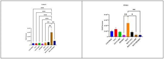 3.4. LEV/CARB Induce Changes Only in the Expression of PARKIN, Whereas ROT Alone Induces Changes in the Expression PINK1 in Exposed Zebrafish