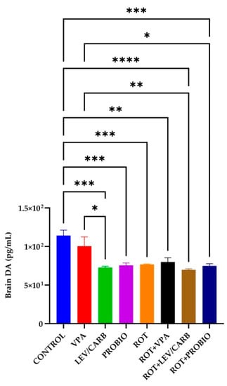 The DA level reached a peak in the group (a) CONTROL, surpassing all experimental groups except (b) VPA, where there is no significance. Precisely, there are statistical differences in the following cases: (c) LEV/CARB, p = 0.000; (d) PROBIO, p = 0.000; (e) ROT, p = 0.001; (f) ROT+VPA, p = 0.002; (g) ROT+LEV/CARB, p <0.0001; and (h) ROT+PROBIO, p = 0.000. Also, in group (b) VPA, there were three situations in which the DA level is elevated compared to (c) LEV/CARB, p = 0.024; (g) ROT+LEV/CARB, p = 0.009; and (h) ROT+PROBIO, p = 0.048 (Figure 8).