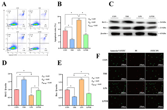 To determine the effect of LPS (5 μg/mL) and THI (5 μg/mL) on REC apoptosis, we used flow cytometry and fluorescence detection experiments. THI deficiency resulted in a significant apoptotic rate compared with the THI group (p < 0.05, Figure 2A–C). LPS stimulation induced a more significant apoptotic rate on RECs than in the CON group (p < 0.05). In addition, the level of Bax protein was significantly increased and Bcl-2 decreased in the LPS group compared with the CON group (p < 0.05; Figure 2D–F). Interestingly, THI co-supplementation (LPTH) reversed LPS-induced apoptosis and changed the level of these proteins compared with the LPS group (p < 0.05).