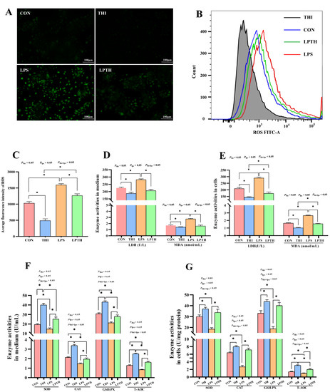 Thiamine (THI) inhibits oxidative damage induced by lipopolysaccharide (LPS) in RECs. (A) Fluorescent staining of reactive oxygen species (ROS) with DCFH-DA. Green staining: ROS. (B) Flow cytometry plots of ROS with DCFH-DA staining. (C) Flow cytometry merge plots of ROS for different treatments. (D) Average fluorescence intensity of ROS. (E,F) Enzyme activities of LDH and MDA in medium and cells. ((G), Enzyme activities of SOD, CAT, GSH-PX, and T-AOC in medium and cells. MDA, malonaldehyde; LDH, lactate dehydrogenase; SOD, superoxide dismutase; CAT, concentrations catalase; GSH-PX, glutathione peroxidase; T-AOC, total antioxidant capacity. Data are presented as means ± SEM (standard error of the mean), n = 3/group (results representative of at least three independent experiments); CON group, no added LPS or THI; THI group, 5 μg/mL THI; LPS group, 5 μg/mL LPS; LPTH group, 5 μg/mL THI and 5 μg/mL LPS. * denotes p < 0.05, significant difference.