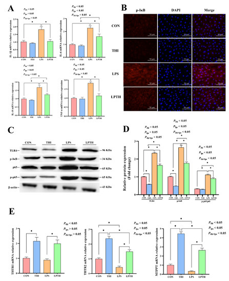 The gene expression of inflammatory factors is presented in Figure 5A. Compared to the CON group, THI treatment did not significantly affect the expression of inflammatory cytokines in the RECs (p > 0.05). As expected, the LPS stimulation induced an increase in IL-1β, IL-6, IL-10, and TNF-α gene expression (p < 0.05) and specifically triggered IκB and TLR4 signaling (p < 0.05) (Figure 5A,B). In contrast, compared with the LPS group, THI supplementation reversed the expression for the above-mentioned genes (p < 0.05). Next, the protein levels of TLR4, phosphorylated NF-κB (p65 subunit), NF-κB (p65 subunit), and phosphorylated IκBα (p-IκBα) were examined (Figure 5C,D). The THI group decreased TLR4 and p-IκBα protein levels compared to the CON group (p < 0.05). Moreover, the LPS group significantly increased the ratio of p-p65/t-p65 and the above protein levels (p < 0.05) compared with the CON group. THI treatment reversed the LPS-induced inflammatory response, resulting in decreased ratios of p-p65/t-p65, as well as p-IκB and TLR4 protein levels in the LPTH group compared with those in the LPS group (p < 0.05). Furthermore, the immunofluorescence results also demonstrated that the LPTH group reliably inhibited activation of p-IκB, as indicated by it being found at lower levels than in the LPS group (Figure 5B).