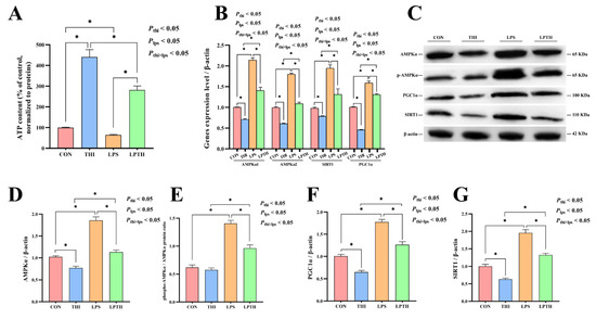 Furthermore, we investigated the effect of THI on the protein levels of AMPKα, phosphorylated AMPKα, PGC1α, and SIRT1 by using Western blot analysis (Figure 6C–G). The protein levels of AMPKα, PGC1α, and SIRT1—which are related to energy metabolism—increased in the CON group (p < 0.05) compared to the THI group, while the LPS-induced group had significantly higher levels of the above proteins than in the CON group (p < 0.05). Meanwhile, the LPS-induced group also exhibited increased ratio of phosphorylated AMPKα to total AMPKα (p < 0.05). Surprisingly, compared to the LPS group, these protein levels decreased in the LPTH group (p < 0.05).