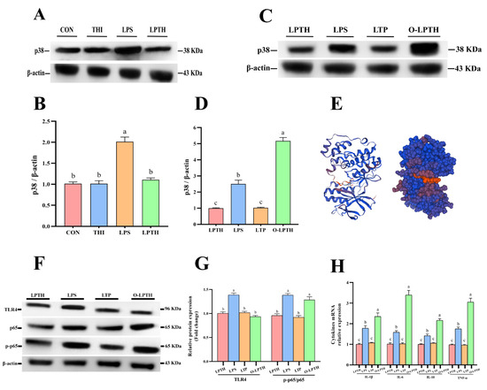 The levels of p38 protein are presented in Figure 7A,B. The LPS treatment increased the levels of p38 protein in RECs compared with the CON group (p > 0.05). As was expected, the LPTH group exhibited a decrease in p38 protein levels (p < 0.05). To further explore whether the inhibitory effect of THI on p38 causes these changes, we overexpressed the p38 gene (Figure 7C,D). The O-LPTH group (cells treated with 5 μg/mL THI and 5 μg/mL LPS after transfection with the p38 gene) increased the ratio of p-p65 to t-p65 compared to those in the LPTH group (p < 0.05, Figure 7F,G). Interestingly, TLR4 protein levels did not change significantly in the O-LPTH group compared to the LPTH group (p > 0.05). In addition, compared with the LPTH group, the O-LPTH group had a significantly increased gene expression of IL-1β, IL-6, IL-10, and TNF-α (p < 0.05, Figure 7H).