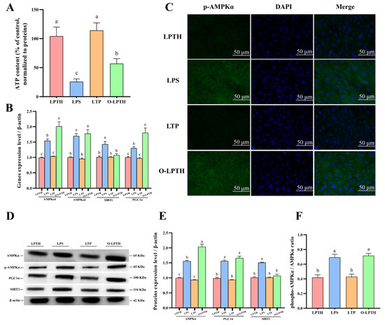 THI supplementation decreased effects of regulation in energy metabolism disturbance induced by LPS in RECs under p38 gene overexpression. (A) ATP content for different treatments. (B) Expression levels of AMPKα1, AMPKα2, SIRT1 and PGC1α genes with different treatments. (C) Immunofluorescence staining of p-AMPKα protein with different treatments. Green: p-AMPKα protein; Blue: nuclei. (D) Representative Western blots for AMPKα, phosphorylated AMPKα (p-AMPKα), SIRT1 and PGC1α protein with different treatments. (E,F) Immunoblotting and measurement of intensity. Protein expression was normalized by the respective abundance of β-actin. Data are presented as the mean ± SEM (standard error of the mean), n = 3/group; CON: Without LPS and thiamine; THI: contains 5 μg/mL thiamine without lipopolysaccharide; LPS: contains 5 μg/mL lipopolysaccharide without thiamine; LPTH: contains 5 μg/mL thiamine and 5 μg/mL lipopolysaccharide. LTP: cells were treated with 5 μg/mL thiamine and 5μg/mL lipopolysaccharide after transfection with empty plasmid vector pcDNA 3.1. O-LPTH: cells were treated with 5 μg/mL thiamine and 5 μg/mL lipopolysaccharide after transfection with p38 gene. At least three independent experiments were performed. Each column with different letters (a–c) are significantly different (p < 0.05).