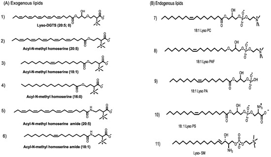 Synthesized derivatives of Lyso-DGTS (A) and lyso-DGTS analogs were purchased from (Sigma–Aldrich–Merck) (B). PC, phosphatidylcholine; PAF, platelet-activating factor; PA, phosphatidic acid; PS, phosphatidylserine; SM, sphingomyelin.