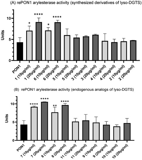 Arylesterase activity of rePON1 after incubation with (A) synthesized derivatives of lyso-DGTS and (B) endogenous analogs of lyso-DGTS. rePON1 (5 µg/mL) was incubated with the lipid at concentrations of 10 and 20 µg/mL for 2 h at 37 °C in Tris buffer pH 8.4. Then, arylesterase activity of rePON1 was measured via phenylacetate assay and the results were expressed as units defined by the ability of rePON1 to hydrolyze 1 mM phenylacetate in 1 min. Each experiment was repeated separately at least three times. * p ≤ 0.05, ** p ≤ 0.01, **** p ≤ 0.0001 relative to the control (PON1; rePON1 without bioactive lipid). Statistical analysis was via one-way ANOVA and Graphpad prism 9 software. See Figure 1 for compounds corresponding to each number.