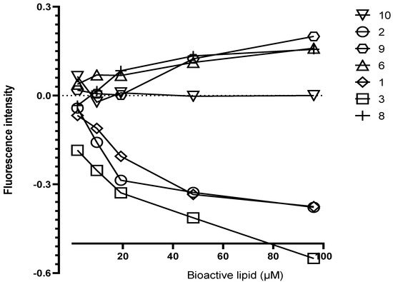 PON1 is known to contain three helical regions; of these, two helices (H1 and H2) can associate with amphiphilic phospholipids. Three out of four Trp residues reside in or close to helical regions H2 and H3 of PON1 [28,30]. Therefore, a Trp fluorescence-quenching assay was carried out to determine possible interactions between rePON1 and the lyso-DGTS derivatives and analogs. The fluorescence-quenching behavior varied widely, from no effect (or even slight enhancement) to strong quenching, up to 100%. As demonstrated in Figure 4, lyso-PA (9), lyso-PAF (8), and compound 6 enhanced the Trp fluorescence intensity of rePON1 in a concentration-dependent manner, suggesting that some Trp residue-containing regions of rePON1 might be exposed to a relatively low level of these compounds. However, three different lipids, the natural lyso-DGTS (1), compound 2, and compound 3, quenched the Trp fluorescence of rePON1 in a concentration-dependent manner, suggesting a specific interaction between PON1 and these lipids. Lyso-PS (10) did not have any quenching effect. There was no correlation between the tested activities of rePON1 and the change in Trp fluorescence.
