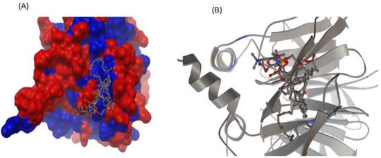 Some of the lipids in the rePON1 groove are orientated nearest α-helix H2. (A) The molecular surface of PON1 shows hydrophilic (red) and hydrophobic (blue) zones docked with the lipid. (B) Location of the lipid within the rePON1 groove showing interactions with the rePON1 groove using the secondary and tertiary structure of rePON1.
