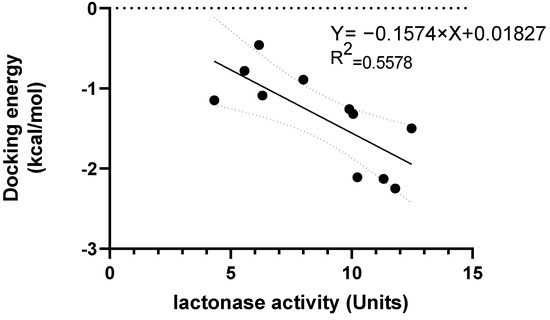 Correlation between the binding energy calculated from the AutoDock Tools program (Y-axis) and the rate at which PON1 catalyzes lactone hydrolysis (X-axis). The anticipated inverse correlation was obtained, with R2 = 0.5578 (p < 0.05).