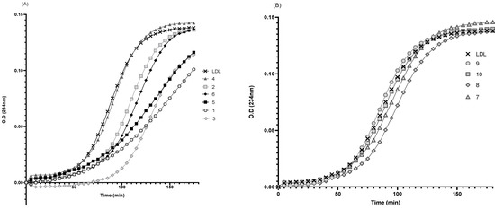 Effect of bioactive lipids on the oxidation of LDL induced by Cu2+. (A) The synthesized exogenous lipids 1–6 and (B) The purchased endogenous lipids 7–10. Conjugated diene formation during copper-mediated LDL oxidation was monitored for 180 min for changes in absorbance at 234 nm. Each experiment was repeated separately three times. Results are presented as mean ± SD. See Figure 1 for compounds corresponding to each number.
