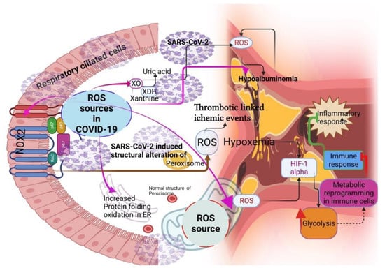 Respiratory viruses, including SARS-CoV-2, can induce ROS-generating sources such as nicotinamide adenine dinucleotide phosphate oxidases (NADPH oxidases) [], xanthine oxidase (XO) [], and mitochondria [] (Figure 2). For instance, the activation of NOX2 and a consequent increase in ROS promote the setting of thrombotic-linked ischemic events in COVID-19 patients [,]. Although there is no direct evidence of XO as a source of ROS in COVID-19, a study showed that COVID-19 patients had hypouricemia (<2.5 mg/dl), which is implicated with the specific dysfunction of the proximal tubule []. As uric acid is an antioxidant, a decrease in uric acid might increase ROS and oxidative stress in the renal artery and further dysfunction in the kidney of COVID-19 patients [], indicating the role of XO as an important source of ROS in COVID-19 []. Mitochondria are crucial sources of ROS, and mitochondrial-triggered ROS induces hypoxia-inducible-1 alpha factor (HIF-1 alpha) for improving glycolysis in the monocytes and macrophages []. This could directly inhibit the immune response, specifically, T-cell response [], and decrease epithelial cell survival in COVID-19 []. Peroxisomes are another detoxifying source of ROS that have close contact with mitochondria as they are involved in the oxidative metabolism of amino acids and fatty acids []. Alterations in the peroxisome structure and loss of matrix content can increase ROS generation []. SARS-CoV-2 ORF14 protein altered the morphology of peroxisomes and their biogenesis by interacting with human PEX14 []. This could tilt the ROS balance in the host cells and increase lipid peroxidation, consequently inducing an inflammatory lipid storm in the lungs of COVID-19 patients by altering the leukotrienes and prostaglandins [,]. A double-center retrospective study reported that COVID-19 patients with severe conditions had hypoxemia [], which may be from the ER stress response induced by ROS generation in the ER through protein-folding oxidation []. Notably, proteins such as serum albumin bind with several transition metals, such as iron and copper, called a “sponge” or a “tramp steamer” [], to decrease ROS generation. The ligand-binding capacities of albumin are the reason for its antioxidant properties [,,,]. A low albumin level could increase the ROS level in COVID-19 patients, and retrospective studies have shown that hypoalbuminemia indicates the COVID-19 severity independent of age and co-morbidity [,].