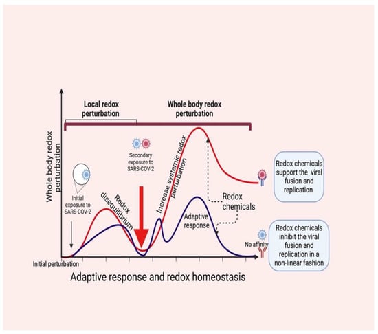 Redox-active molecules coordinate the systemic redox network (nonlinearly) locally first (beginning of the redox disequilibrium), and then turn to the entire system [], which collapses the systemic redox equilibrium. Consequently, changes in the redox tones in the cells induce an “oxidative storm” in place of the “cytokine storm” [], which could allow SARS-CoV-2 (probably a secondary exposure) to bypass redox-mediated immune vigilance (respiratory burst). This scenario can encourage virus fusion and viral loads to increase within the infection (Figure 3) [,].