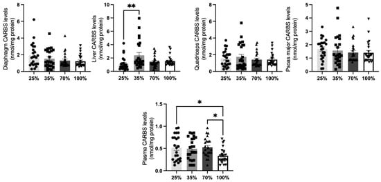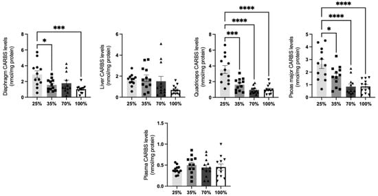 CARBS levels were reduced only in the blood of the lambs that were at the 100% d.s. (p < 0.05, Figure 2). Additionally, after an initial increase at 35% d.s., CARBS at the liver of lambs at 70% and 100% d.s. returned to the levels that were observed at the 25% d.s. No other significant change was observed in all other tissues tested.