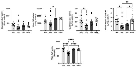 Since catalase is one of the most abundant enzymes in the cell with antioxidant properties, CAT activity determination can reflect the antioxidant state of the tissue tested []. CAT activity (Figure 3) at the quadriceps, the psoas major, and the RBCL was significantly (p < 0.05) reduced at the 35% compared to the 25% d.s. of the kids. Nevertheless, CAT activity at the 70% and 100% d.s. returned to weaning levels of 25 d.s. (Figure 3). CAT activity was elevated in the at the 70% d.s. compared to the 35% d.s. No other significant differences were revealed (p > 0.05) (Figure 3).