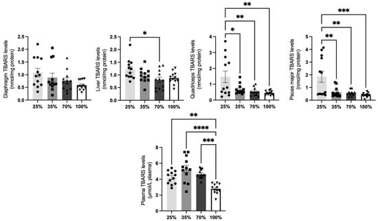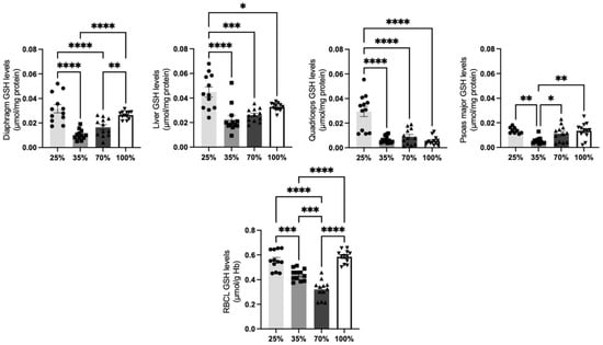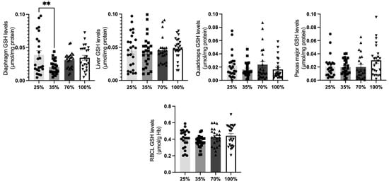 GSH levels in lamb tissues did not proclaim significant alterations across the examined d.s. (p > 0.05), apart from a significant (p < 0.05) decrease in the diaphragm at 35% compared to the 25% d.s. (Figure 6).