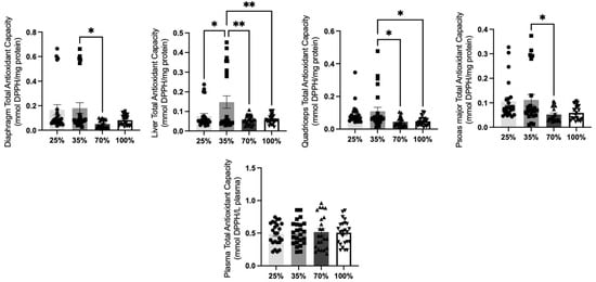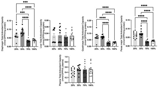 Regarding TAC levels in the lambs, a significant (p < 0.05) decrease was observed at 70% d.s. compared to 35% d.s. in all tissues tested, except for plasma, showcasing a pattern of antioxidant decadency after post-weaning period (Figure 8). Liver and quadriceps tissues from lambs at 100% d.s. revealed significantly decreased TAC levels (p < 0.05) compared to 35% d.s. However, higher liver TAC levels were reported at 35% d.s. compared to 25% d.s. (Figure 8). Plasma TAC levels did not show any significant (p > 0.05) differences among all four d.s. tested (Figure 8).