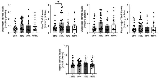 In lambs, TBARS levels of all tissues remained stable among d.s. (p > 0.05). The only exception was detected in the liver, in which a significant (p < 0.05) increase was found at 35% d.s. compared to 25% d.s. (Figure 10).