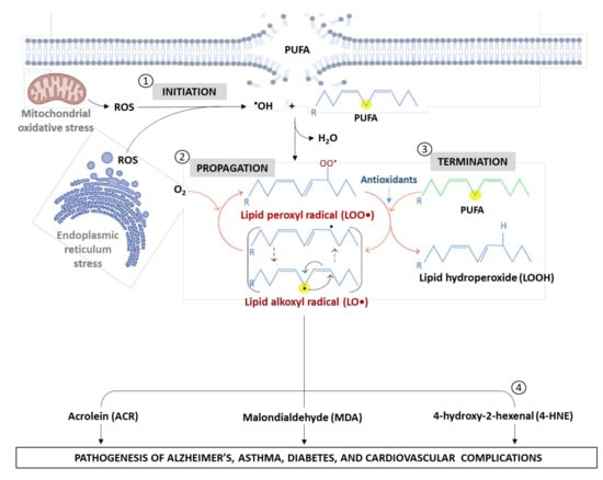 Lipid peroxidation occurs in response to oxidative stress, which is a well-studied pathological process that is characterized by an excessive production of free radical species that cause depletion of intracellular antioxidant reserves [27,28]. As illustrated below, lipid peroxidation describes a miscellaneous pathological mechanism that mainly implicates either non-enzymatic or enzymatic reactions (Figure 1).