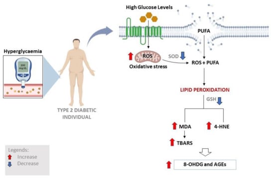 Additionally, a recent study reported that MDA levels were significant increase in patients with complications and without complications as compared to their heathy counterparts along with a significant reduction in SOD activity in T2D patients [75]. In agreement, others have shown that MDA levels were significantly elevated in patients with T2D, and this effect was more pronounced in those with microvascular complications when compared to healthy control subjects [47,76]. Apparently, elevated plasma levels of MDA in poorly controlled diabetic patients with dyslipidemia are almost 2.9 times higher when compared to normoglycemic subjects [22]. Few studies have evaluated levels of 4-HNE, another lipid peroxidation biomarker, and showed increased levels of 4-HNE in patients with T2D [77,78]. Furthermore, it has been demonstrated that serum levels of 4-HNE were significantly increased which correlated with disease progression in patients with T2D [12]. Additionally, prominent biomarkers of oxidative stress and lipid peroxidation such as MDA, 4-HNE and ROS levels were significantly increased in preclinical models of diabetes along with a decrease in intracellular antioxidant defenses [79]. In addition, Miwa et al. (2000) suggested that the excessive production of 4-HNE impairs glucose-stimulated insulin secretion in isolated pancreatic β-cells, contributing to the death of pancreatic β-cells in T2D [78]. It is noteworthy that patients with T2D are at increased risk of developing metabolic complications and cardiovascular disease (CVD), especially through the formation of diverse microvascular and macrovascular abnormalities, leading to increased morbidity and mortality [80,81,82]. Apparently, T2D is responsible for at least two-four-fold rise in the incidence of coronary artery disease, which is linked with accelerated heart failure in patients with diabetes [81,82]. Furthermore, biomarkers of cardiometabolic diseases, such as low-density lipoprotein and total cholesterol, in relation with oxidative stress, are much higher in these patients when compared to non-diabetic controls [71,81]. Figure 2 gives a general perspective to highlight some of the pathological consequences of oxidative stress in conditions of hyperglycemia; of which lipid peroxidation is a major component that correlated positively with protein as well as nucleic acid oxidation which is indicated by increased advanced glycation end products (AGEs) and 8-hydroxydeoxyguanosine (8-OHDG), respectively [83,84]. Therefore, decreasing or limiting the formation of lipid peroxidation products could be beneficial in restricting the deleterious effects of oxidative stress in T2D.