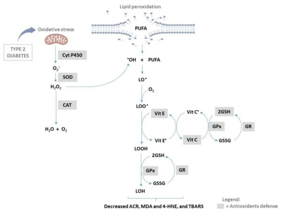 Lipid peroxidation briefly entails an endogenous chain reaction where free radical species such as reactive oxygen species (ROS) cause oxidative degradation of phospholipids resulting in the production of wide a variety of oxidation products [9]. Free radical species for example can attack lipids that contain carbon-carbon bond such as PUFAs in the cellular membrane [10]. The foremost lipid peroxidation byproducts are malondialdehyde (MDA), thiobarbituric acid reactive substances (TBARS), lipid hydroperoxides (LH), and 4-hydroxy-2-Nonenal (4-HNE). Importantly, MDA and 4-HNE are the major aldehydic metabolites of lipid peroxidation that have been widely studied and have been implicated as good biomarkers of lipid peroxidation [11]. These byproducts of lipid peroxidation are involved in oxidative damage of cells, DNA, as well as proteins. Additionally, they can influence signaling pathways involved in oxidative cascade, contributing to the development and severity of many diseases, including the pathophysiology of diseases such as type 2 diabetes (T2D). In fact, lipid peroxidation plays a significant role in the development of atherosclerotic cardiovascular disease, which by far the most cause of death in patients with T2D [12]. Biomarkers of lipid peroxidation including elevated levels of TBARS were significant significantly higher in the plasma of patients with T2D in comparison to healthy subjects [13]. Beyond its implication during the development of T2D, elevated biomarkers of lipid peroxidation have been crucial in highlighting the pathological role of oxidative stress during the pathogenesis of other conditions, including cerebral vascular disease [14,15], obesity-driven cancer [16,17,18], and age-related dementia [19]. Thus, it is essential to recognize antioxidant therapies as a potential strategy to combat lipid peroxidation and oxidative stress during the development of diverse chronic diseases, including T2D [20].