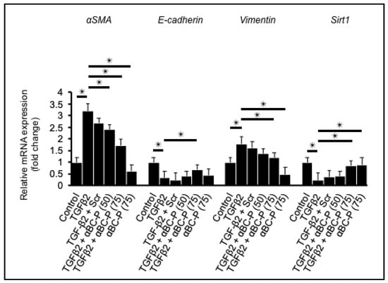 We examined the expression of EMT- and MET-related markers, αSMA, Vimentin, E-cadherin, and Sirt1. Expression of these EMT-related genes after 48 h in TGFβ2 (10 ng/mL) -treated hRPE cells showed a significant 3-fold and 1.5-fold upregulation of αSMA and Vimentin mRNA levels. On the other hand, MET-related genes after 48 h TGFβ2 treatment showed a significant 3-fold and 4-fold downregulation of E-cadherin and Sirt1 mRNA levels. αBC-P co-treatment significantly (p < 0.01 vs. TGFβ2 treated cells) inhibited TGFβ2-induced upregulation of both αSMA and Vimentin at the mRNA levels at 50 and 75 µg/mL concentrations and caused downregulation of both E-cadherin and Sirt1 at the mRNA levels (Figure 1). Data for scrambled αBC-P (75 µg/mL) is also included in the figure.