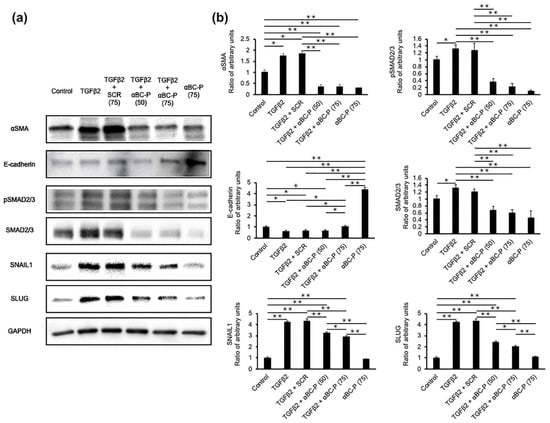 We examined the expression of EMT- and MET-related proteins, αSMA, pSMAD2/3, SMAD2/3, and E-cadherin (Figure 2a). Expression of EMT-related proteins after 48 h in TGFβ2 (10 ng/mL)-treated hRPE cells showed a significant upregulation of αSMA, pSMAD2/3, SMAD2/3 protein levels. On the other hand, expression of MET-related protein E-Cadherin after 48 h in TGFβ2 hRPE cells showed significant downregulation. αBC-P co-treatment significantly (p < 0.01 vs. TGFβ2 treated cells) inhibited upregulation of αSMA, pSMAD2/3, and SMAD2/3 protein expression, while αBC-P caused a significant upregulation of E-cadherin (Figure 2b). We also investigated the expression of the key transcription factors for EMT, SNAIL and SLUG. SNAIL and SLUG were significantly upregulated in TGFβ2-treated hRPE cells, however, their upregulation was attenuated by co-treatment with αBC-P (p < 0.01 vs. TGFβ2-treated cells). Additionally, immunostaining with αSMA, E-cadherin, and Vimentin yielded results that supported the trend shown in Figure 2a,b. The epithelial marker, E-cadherin was restored following co-treatment with TGFβ2 and αBC-P (Figure 2c).