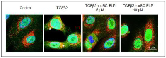 A mitochondrial role of SMAD4 in the pathogenesis of diabetic nephropathy has been reported recently []. Therefore, we examined whether TGFβ2 induces SMAD4 mitochondrial translocation in hRPE cells. TGFβ2 treatment for 24 h induced SMAD4 mitochondrial translocation in hRPE cells. On the other hand, co-treatment with αBC-ELP inhibited TGF-β2 -induced SMAD4 mitochondrial translocation (Figure 4).