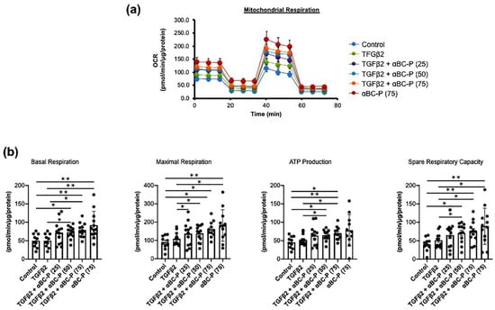 We investigated mitochondrial function in TGFβ2 (10 ng/mL)-induced hRPE cells. In comparison to control cells, TGFβ2 treated hRPE cells show higher maximal respiration, ATP generation, and spare respiratory capacity. Co-treatment of hRPE cells with αBC-P significantly increased all mitochondrial bioenergetic parameters in a concentration-dependent manner compared to TGFβ2-treated hRPE cells (Figure 5b). Additionally, identical patterns were seen for non-mitochondrial oxygen consumption and proton leak measurements (Figure S1). These results suggest that αBC-P augments mitochondrial energy metabolism in TGFβ2-treated EMT in RPE cells.