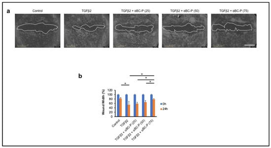The effect of αBC-P on cell migration was evaluated using an in vitro scratch assay [,]. hRPE cells were incubated in a 3% FBS medium overnight. Immediately following scratch injury, hRPE cells were treated with TGFβ2 (10 ng/mL) with or without αBC-P (25, 50, and 75 μg/mL). Low (25 μg/mL) and intermediate concentration (50 μg/mL) αBC-P did not inhibit TGFβ2-induced hRPE cell migration, whereas the high dose of αBC-P used (75 μg/mL) significantly inhibited the cell migration (Figure 7). These results suggest that αBC-P may inhibit PVR progression by inhibiting hRPE cell migration.