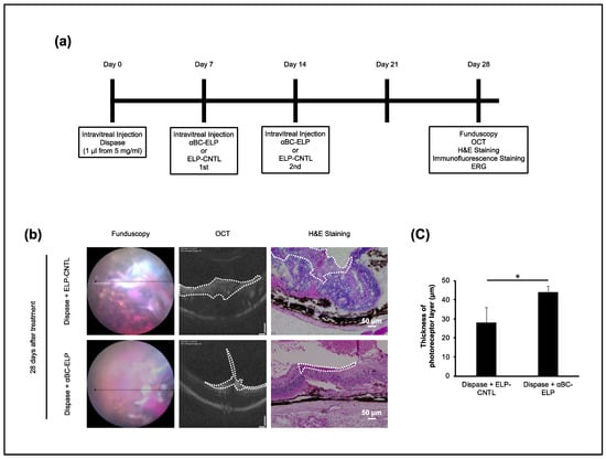 We used dispase-induced PVR in mice to investigate the profibrotic effect of αBC-ELP in vivo. In this model, intravitreal injection of dispase induced a PVR-like phenotype characterized by a proliferative membrane or retinal detachment. This resulted in migration of RPE cells to vitreous components, predisposing factors associated with PVR development [,,]. A scheme depicting the experimental protocol is presented in Figure 8a. Our results revealed that Fundus, OCT, and histological analysis showed a less proliferative membrane in dispase with αBC-ELP treated compared with dispase-treated mice (Figure 8b). Moreover, the structure of the retina, RPE and photoreceptor layer (Figure 8c) was better preserved in the dispase + αBC-ELP treatment group. The thickness of the photoreceptor layer was also examined. Compared to the control group, the group that had received αBC-ELP treatment had a considerably intact photoreceptor layer (Figure 8c). However, the functional studies did not support this improvement in photoreceptor structure. These results indicate that αBC-ELP may inhibit the formation of proliferative membranes and prevent retinal damage caused by membrane traction.