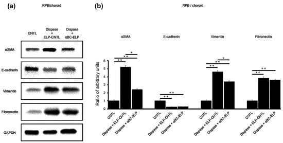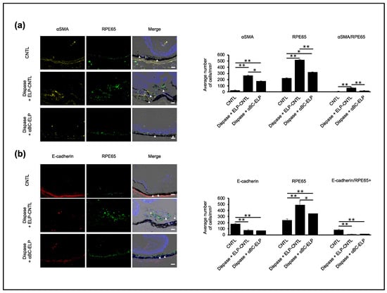 We used immunostaining to investigate the effect of αBC-ELP on EMT in vivo. αSMA expression was significantly (p < 0.05) decreased in mice treated with dispase and αBC-ELP compared to dispase-only treated mice. On the other hand, the expression of E-cadherin showed no significant difference between the two groups (Figure 9b). RPE65 expression that corresponds to RPE migration was significantly (p < 0.05) increased in the dispase-treated mice, whereas it significantly decreased with αBC-ELP treatment (Figure 10a). Furthermore, RPE65-expressing cells maintained a monolayered structure in αBC-ELP treated mice as seen in normal eyes (Figure 10a). These results suggest that αBC-ELP may suppress cellular EMT and inhibit the progression of PVR in vivo.