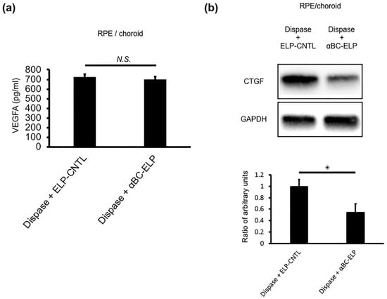 (a) VEGFA is measured by ELISA (a). CTGF cytokine is analyzed by WB (b). CTGF expression was significantly decreased with αBC-ELP treatment. Values are means ± SEM. N.S.: not significant, αBC-ELP: αB crystallin-Elastin-like peptide. * p < 0.05. n = 3.
