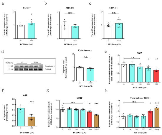 In order to identify the highest BCS dose that could effectively deplete intracellular copper, we treated DPCs in vitro with multiple concentrations of BCS. Our results showed a dose-dependent reduction in copper levels with treatment (Figure 1a). Additionally, the BCS treatment did not affect the cell viability at dosages of up to 1000 µM (Figure 1b). We next determined the most appropriate time for BCS treatment and found that BCS treatment at 1000 µM consumed the intracellular copper concentrations after 24 h of treatment initiation (Figure 1c). These findings were consistent with those of Krishnamoorthy [30]. Copper uptake and transportation are strictly controlled by various cellular mechanisms. After copper uptake into cells through CTR1, several copper chaperone proteins deliver the copper to defined organelles and proteins (e.g., CCS transports copper to SOD1, while COX17 transports copper to complex IV) [28,29]. COX17 is a copper chaperone that showed similarity to CCS. Accordingly, the detected increase in COX17 mRNA levels was indicative for the depletion of mitochondrial copper (Figure 2a). Song et al. demonstrated that Sp1 functions as a copper sensor that regulates the CTR1 expression in response to variations in copper concentrations [31]. We believe that the increases in the mRNA expression levels of SP1 (Figure 1d) and CTR1 (Figure 1e) that were observed in this study likely occurred as a response to intracellular copper depletion. Moreover, western blot analysis further demonstrated that the protein expression of MTCO1 was reduced in BCS-treated DPCs (Figure 1f). Ramchandani [9] demonstrated that copper depletion did not affect the mRNA levels of either MTCO1 or COX4I1, which is consistent with our findings (Figure 2b,c). Although BCS-mediated copper depletion did not affect the protein level of cytochrome c (Figure 2d), it did lead to a significant decrease in the levels of cytochrome c oxidation (Figure 2e) and ATP production (Figure 2f). COX is the terminal enzyme of the mitochondrial ETC and is involved in the formation of the MMP, which is used by F1F0-ATPase to drive the production of ATP [32]. Our results showed that BCS-mediated copper depletion significantly decreased the MMP (Figure 3a), which is the main reason for the decrease in the ATP generation. As signaling molecules, ROS play an important role in cell proliferation and cell fate determination, but excessive ROS production can lead to irreversible cell damage and cell death [33,34]. While complex I and complex III are direct sites of ROS generation, perturbations of COX activity can indirectly increase the mitochondrial ROS production [35], which is consistent with our results (Figure 2h). In fact, elevated ROS levels induce oxidative stress and are, in combination with free Fe2+ and disturbed GPX4 activity, markers for ongoing ferroptosis [6,14,15].
