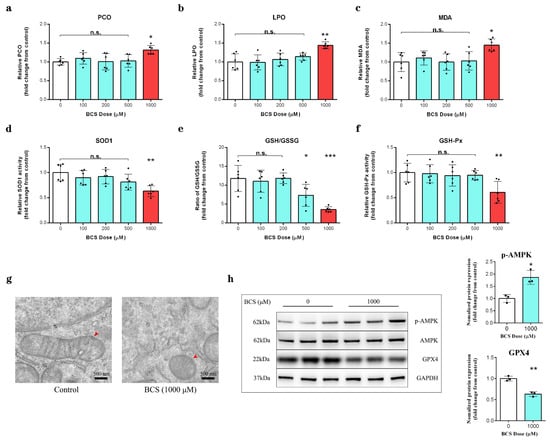 (a–c) Measurement of protein carbonylation, LPO, and MDA contents in DPCs after 72 h of treatment with BCS (1000 µM) (n = 6/group). n.s. no significance; * p < 0.05; ** p < 0.01. (d) Measurement of SOD1 activity in DPCs after 72 h of treatment with BCS (1000 µM) (n = 6/group). n.s. no significance; ** p < 0.01. (e) The GSH/GSSG ratio in DPCs was determined after 72 h of treatment with BCS (1000 µM) (n = 6/group). n.s. no significance; * p < 0.05; *** p < 0.001. (f) GSH-Px activity in DPCs was measured after 72 h of treatment with BCS (1000 µM) (n = 6/group). n.s. no significance; ** p < 0.01. (g) The structure of mitochondria as determined by transmission electron microscopy (×50,000), red arrows indicate normal/folded and perturbed cristae morphology in DPCs. Scale bar, 500 nm. (h) Western blot analysis of the protein levels of phosphorylated (p)-AMPK (Thr172) and GPX4 in the control and BCS-treated (1000 µM) DPCs (n = 3/group). n.s. no significance; * p < 0.05; ** p < 0.01.