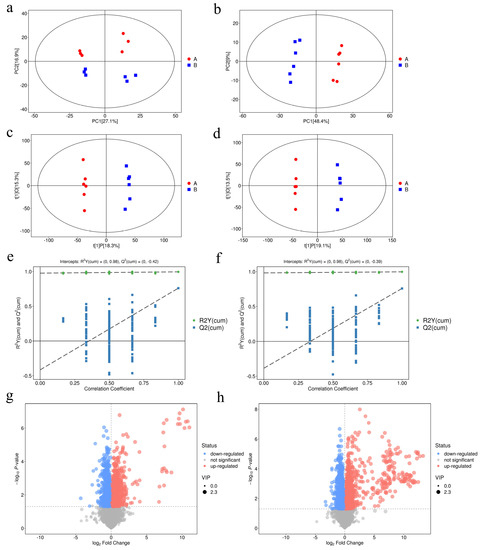 (a,b) Principal component analysis (PCA) under (a) positive ion mode (POS) and (b) negative ion mode (NEG). (c,d) orthogonal projections to latent structures-discriminate analysis (OPLS-DA) under (c) positive ion mode and (d) negative ion mode. (e,f) A permutation test was implemented to assess the robustness and predictive ability of the OPLS-DA model under (e) positive ion mode and (f) negative ion mode. Class (A) represents the control samples and class (B) represents BCS samples. (g,h) Volcano plots of metabolites under positive ion mode and negative ion mode, respectively (n = 6). The x-axis represents the Log2(fold change), and the y-axis represents the −Log10(p-value). The red points represent significantly upregulated metabolites, the blue points represent significantly downregulated metabolites, and the gray points represent metabolites showing no change.