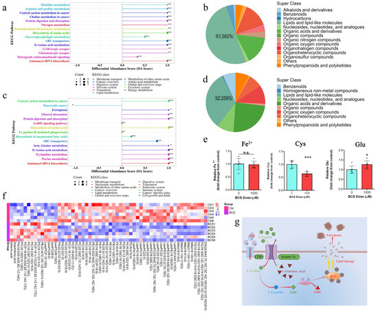 (a,c) Differential abundance score plot under the positive ion mode (a) and negative ion mode (c), respectively (n = 6). The x-axis represents the DA-Score, and the y-axis represents the KEGG metabolic pathway. The size of each dot represents the metabolite number, the dots are distributed on the right side of the central axis, and the longer the line segment is, the more the overall expression of the pathway tends to be up-regulated. * p < 0.05; ** p < 0.01; *** p < 0.001. (b,d) Differential metabolites were classified using the KEGG databases under positive ion mode (b) and negative ion mode (d), respectively (n = 6). (e) Measurement of Fe2+, cysteine, and glutamic contents in dermal papilla cells (DPCs) after 72 h of treatment with BCS (1000 µM) (n = 6/group). n.s. no significance; * p < 0.05; ** p < 0.01. (f) Clustering heat map of lipids and lipid-like molecules (n = 6). (g) Model depicting that the inhibited System Xc- reduces the uptake of cystine, driving ferroptosis.