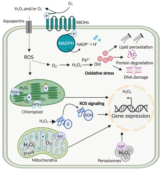 The oxidative stress signaling in plant cell compartments. ROS, such as O2•− and H2O2 are produced by NADPH oxidases specifically RBOHs at the apoplast, accumulating in chloroplast, mitochondria, peroxisomes, and nuclei. Accumulation of H2O2 in the presence of F2+ form hydroxyl radicals and initiates oxidative stress that results in distorting the structure of lipids, proteins, and DNA. Later, the integration of enzymes, such as SODs, APXs, DHAR, and CAT in cell organelles maintains ROS levels and gene expression.