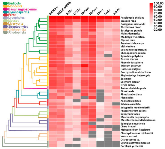 Comparative molecular evolution of key photosynthetic redox regulators and photosynthesis protein families in algae and land plants candidate proteins were extracted using BLASTP (NCBI), and the all-against-all BLASTP search with satisfied E-value of 10−10 and query coverage of 50%. Heat map was generated using TBtools [85] from the data of seven photosynthesis-related proteins and four redox-related families. Black squares indicate the proteins that do not satisfy the selection criteria. ACHTs: atypical Cys His-rich, CF1-y: gamma subunit of ATP synthase; CP12; FBPase: fructose-1,6-bisphosphatase; GADPH: glyceraldehyde-3-phosphate dehydrogenase; NADP-MDH: NADP+ dependent malate dehydrogenase; RCA: ribulose-1,5-bisphosphate carboxylase/oxygenase activase; SBPase: sedoheptulose-1,7-bisphosphatase; TrxLs: Trx-like.