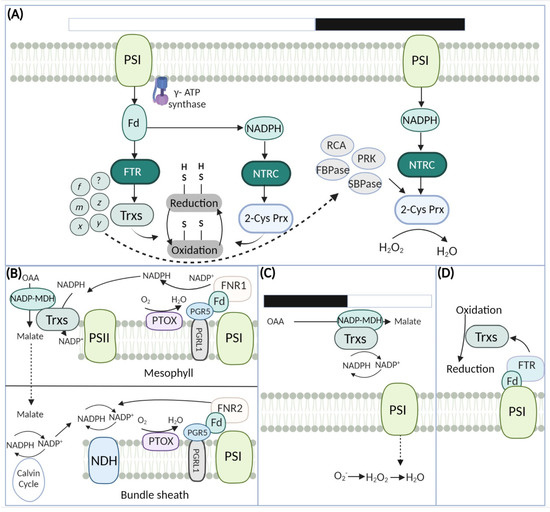 Crassulacean acid metabolism (CAM) functions by closing stomata during the daytime and fixing CO2 at nighttime [175,176] (Figure 4C). CO2 fixation occurs in malic acid at night, which is subsequently stored in the vacuole of MC. Similar to C4 photosynthesis, NADP-MDH dependent oxidation linked with Trx systems has been observed in CAM plants [117]. In C3 angiosperms, over-reduction of acceptor side of PSI and chloroplast stroma mediated “match valve” system transfer reducing equivalents to the cytosol, which generates NADP+ under light fluctuations [163,177]. It is still largely unknown whether CAM plants have a water-water cycle as C3 plants for adjusting PS1 redox status or restricted CO2 fixation under malic acid exhaustion. Recently, studies based on redox regulation in CAM photosynthesis of Bryophyllum pinnatum [178], Dendrobium officinale [179,180], and Vanilla planifolia [181] demonstrate that CEF and water-water cycle could be an important regulator as adjusting PSI redox homeostasis under light fluctuations. However, research work on redox homeostasis and photosynthesis in CAM plants requires acceleration to better compare the research advances in C3 and C4 plants.