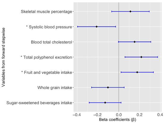 Finally, fruit and vegetable intake (β = 0.175; p = 0.025), TPE (β = 0.225; p = 0.004) and SBP z-score (β = −0.235; p = 0.004) showed a statistically significant association with NO, whereas TC (β = 0.140; p = 0.071), skeletal muscle percentage (β = 0.111; p = 0.190), and the intake of sugar-sweetened beverages and whole grains (β = −0.131; p = 0.091 and β = −0.104; p = 0.189, respectively) were not significantly associated with NO in the multiple linear regression model adjusted by confounding factors (Figure 1).