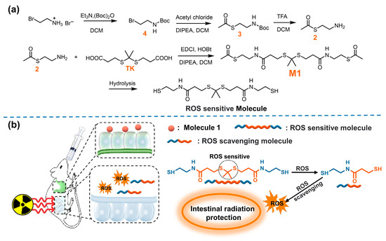 In this study, we designed, synthesized, and evaluated a new oral ROS-responsive radioprotective compound. As shown in Figure 1a, compound M1 was obtained through the reaction of intermediate compound 2 and TK and hydrolyzed under alkaline conditions to obtain ROS-responsive active molecules. The compound exists stably in acidic environments and can be hydrolyzed to release active molecules with abundant free thiol in intestinal alkaline environments. In the case of ROS eruption after irradiation, the TK response group breaks and forms active molecules capable of scavenging ROS (Figure 1b). Therefore, the ROS-responsive molecule was expected to be a promising candidate radioprotector by oral administration.