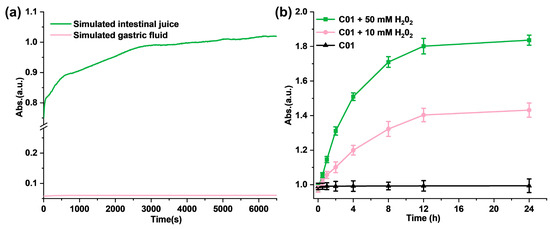 (a) The hydrolysis kinetics of M1 in solution in simulated gastric juice and simulated intestinal fluid; (b) ROS-responsive fragmentation of M1 molecules in PBS in vitro.