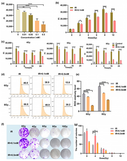 (a) The ROS levels in cells treated with various concentrations of M1 at 8 h after 4 Gy irradiation. (b) The ROS levels in M1 treated and untreated cells at 8 h after various doses of irradiation. (c) The ROS levels in M1 treated and untreated cells at various times after 4, 6, and 8 Gy irradiation. (d) Flow cytometry ROS analysis of HIEC-6 cells treated with groups of IR, IR + 0.1 mM, and IR + 0.5 mM at 24 h after 6 and 8 Gy irradiation (numbers represent ROS level). (e) Quantitative analysis of ROS level from (d). (f) Typical clone images of HIEC-6 cells belong to groups of IR, IR + 0.1 mM, and IR + 0.5 mM at 10 days after 0, 4, 6, 8, and 10 Gy irradiation. (g) Quantitative analysis of survival fractions from (f). Results are presented as the mean ± SD in triplicate and analyzed by one-way ANOVA.