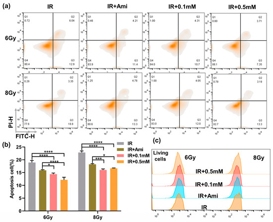 (a) Flow cytometry apoptosis analysis of HIEC-6 cells treated with groups of IR, IR + Ami, IR + 0.1 mM, and IR + 0.5 mM at 24 h after 6 and 8 Gy irradiation. (b) Living cells analysis from (a). (c) Quantitative analysis of apoptosis cells from Figure 4a. Results are presented as the mean ± SD in triplicate.