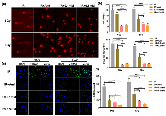 (a) Typical comet assay images of HIEC-6 cells treated with groups of IR, IR + Ami, IR + 0.1 mM, and IR + 0.5 mM after 6 and 8 Gy irradiation. (b) Quantitative analysis of olive tail moment and tail DNA from (a). Results are expressed as the mean ± SD of 50 replicates. (c) CLSM microscopy observation of γ-H2AX immunofluorescence of HIEC-6 cells treated with groups of IR, IR + Ami, IR + 0.1 mM, and IR + 0.5 mM after 6 and 8 Gy irradiation. (d) Quantitative analysis of γ-H2AX foci from Figure 5c. Results are expressed as the mean ± SD of 20 replicates.