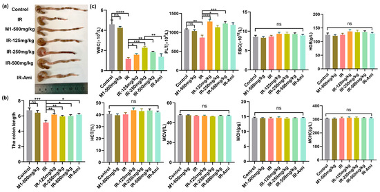 (a–c) Colon tissues, lengths, and hematopoietic system analyses of mice in control, IR, M1-500 mg/kg, IR + 125 mg/kg, IR + 250 mg/kg, IR + 500 mg/kg, and IR + Ami groups three days after 13 Gy ABI, n = 6 per group.