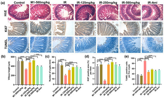 (a) Representative images showing the structure in cross-sections of the small intestine with hematoxylin and eosin (H&E), Ki67, and TUNEL staining. Scale bar: 200 μm. (b–e) Histogram showing the number of crypts, villus lengths, and Ki67 positive and TUNEL positive cells in intestinal sections from the control, IR, M1-500 mg/kg, IR + 125 mg/kg, IR + 250 mg/kg, IR + 500 mg/kg, and IR + Ami groups. The results are represented as mean ± SEM, n = 6 mice per group. *** p < 0.001, **** p < 0.0001 by one-way analysis of variance (ANOVA).