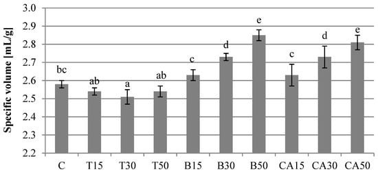 The specific volume of the analyzed breads. Bars represent means ± standard deviation, (n = 9, for each bread type). The values marked with different letters are significantly different (p < 0.05).